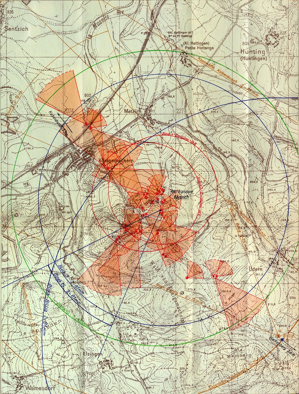Darstellung der Reichweite einzelner Waffen vom Artilleriewerk Metrich Quelle: Denkschrift über die französische Landesbefestigung Oberkommando des Heeres 1941 |