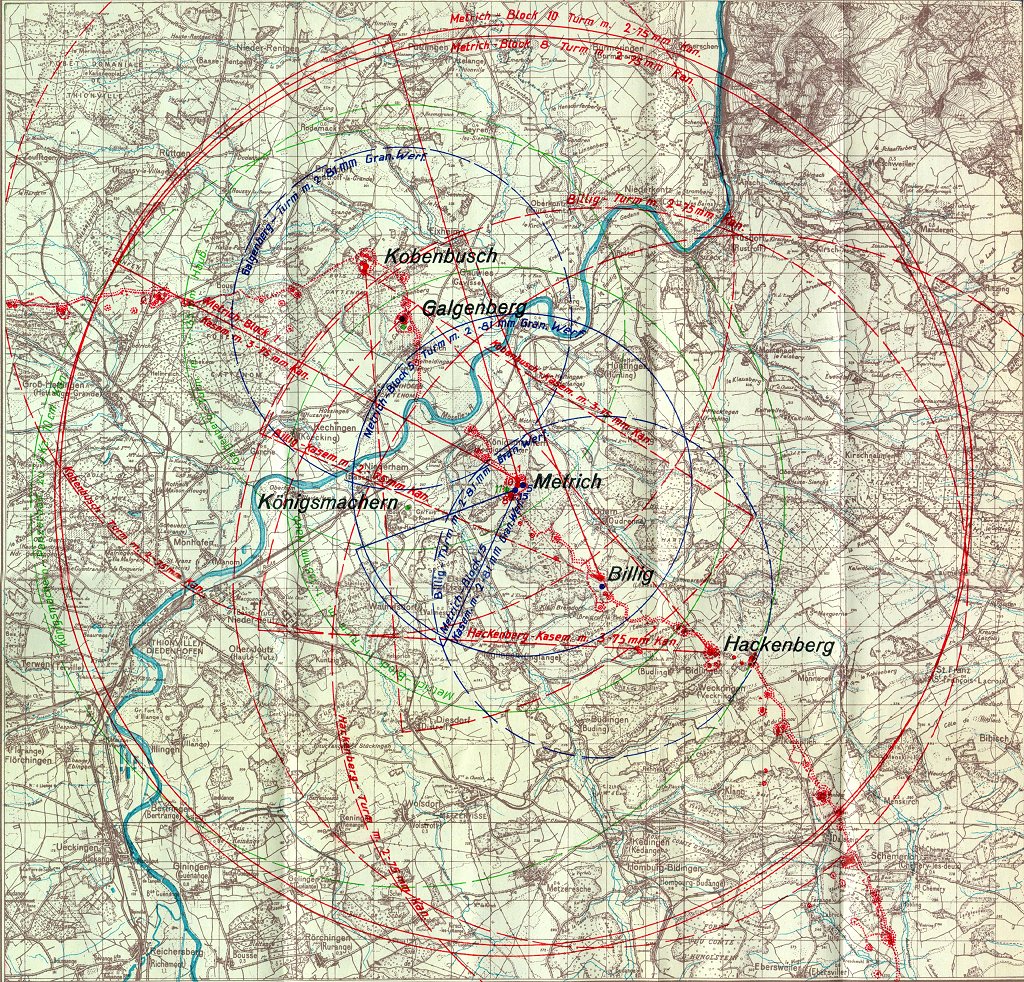 Die Zwischenräume zwischen den Werken Metrich und Billig sowie Billig und Großgruppe Hackenberg betragen je drei Kilometer, zwischen Metrich und Galgenberg sechs Kilometer. Von den Werken aus konnten diese Zwischenräume in ihrer Ausdehnung nur durch flankierendes Artilleriefeuer bestrichen werden; sie waren aber zu groß, um ein lückenloses Infanteriefeuer zu gewährleisten, ganz abgesehen davon, daß auch das Gelände wenigstens nach Südosten dies infolge seiner welligen Oberfläche nicht zuließ. Als Bindeglied zwischen den Werken dienten daher folgende Zwischenwerke:
