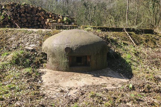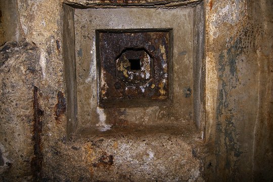 Eingangsblock: Zwei GFM-Panzerglocken Typ A für MG FM24/29 oder 50 mm Granatwerfer und eine Scharte für das das Zwillings-MG Reibel MAC 31 oder austauschbar eine 47 mm PaK. |