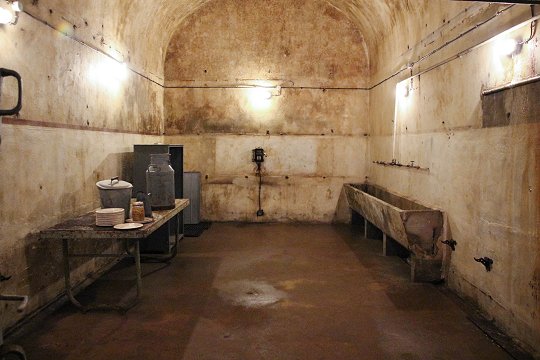 Block 6: Ein Panzerturm mit zwei 13,5 cm Haubitzen, eine GFM-Panzerglocke Typ A für MG FM24/29 oder 50 mm Granatwerfer, eine Glocke für Granatwerfer und eine Panzerglocke für Zwillings-MG als Notausstieg. | |
