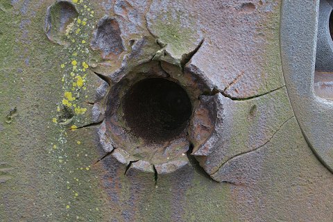 Treffer einer 8,8cm Granate, die den Stahl nicht durchschlug. |