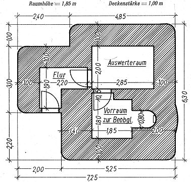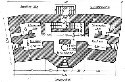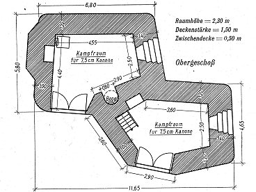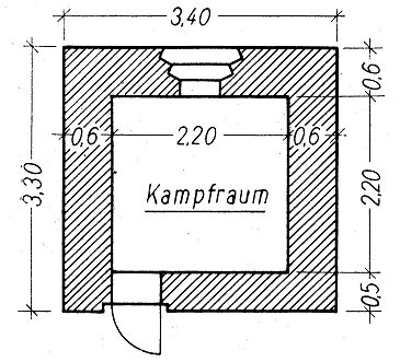 MG-Stand mit zwei Scharten gleicher Schußrichtung Diese Stände sind häufig in dem befestigten Gebiet von Lüttich, hinter der Maas und in der Festung Namur, ferner im Brüsseler Ring und im Genter Brückenkopf gebaut worden. Sie haben den Vorteil großer Feuerkraft in einer Richtung. Die beiden Kampfräume sind durch eine Zwischenwand getrennt, die aber nicht voll durchgezogen ist. |