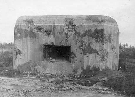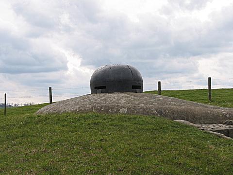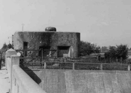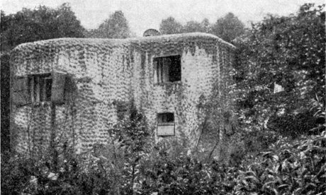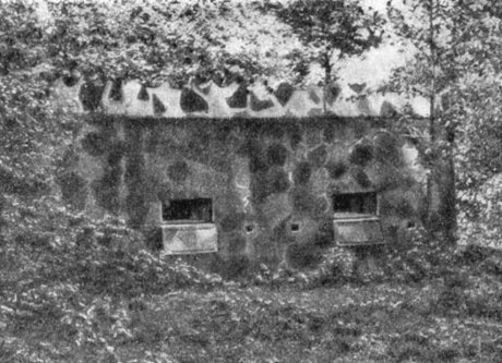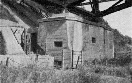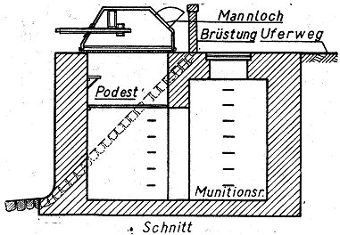 MG-Stand mit einer Scharte und Flügelmauer Die Flankierungsanlagen an den Wasserflächen der Kanäle und des Panzerwagengrabens von Antwerpen waren mit Flügeln versehen, um die Scharten gegen Frontalfeuer zu decken. |