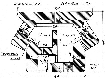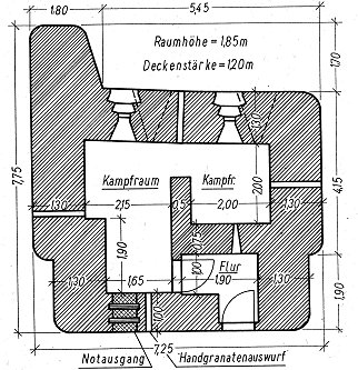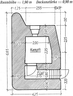 MG-Stand mit einer Scharte Soweit das eingesetzte MG nicht eine auf die Stellung zuführende Straße zu bestreichen hatte, wurde die Scharten so angeordnet, daß sie gegen Frontalfeuer geschützt waren. Von diesem Stand entwickelte Belgien zwei Bauformen. In den Grenzstellungen der Provinz Luxemburg und in der vorgeschobenen Linie des befestigten Gebietes von Lüttich fand sich die einfache Form. Da dieser Stand nur einen kleinen Kampfraum besaß, zog die Truppe es vielfach vor, ihn nicht zu besetzen, sondern schuf daneben eine feldmäßige Anlage. Die andere Regelform, findet sich besonders in den Hauptstellungen des befestigten Gebietes von Lüttich. Um die Scharten gegen Frontalfeuer zu schützen, waren diese Stände oftmals mit Flügeln versehen. |