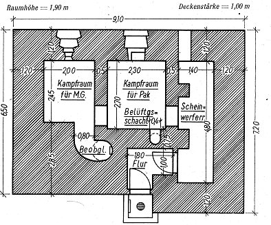 Pak-Schartenstände Pak-Schartenstände sollten Straßen und Brücken bestreichen. Daher haben sie Frontalscharten. Pak-Schartenstände mit flankierenden Scharten zur Zwischenfeldbestreichung baute Belgien nicht. Die Bewaffnung der Anlagen bestand entweder aus 1 Pak oder 1 Pak und MG. Einige Stände besaßen eine Beobachtungsglocke. Größere Anlagen besaßen außerdem Scheinwerfer- und Bereitschaftsräume. Bei beengten Platzverhältnisse sind die Stände auch mehrstöckig errichtet. |