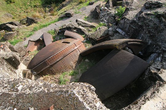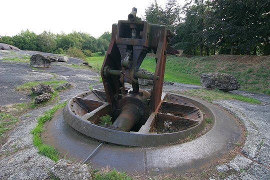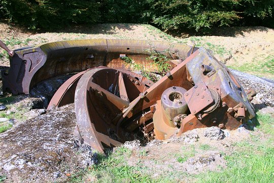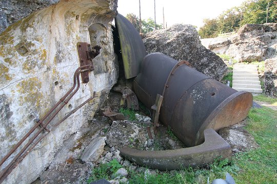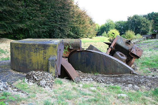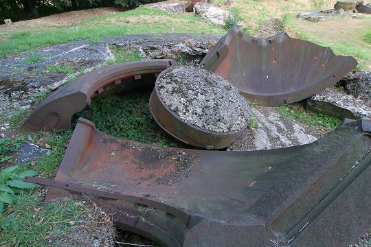 Der linke zerstörte 21cm Gruson-Panzerturm |