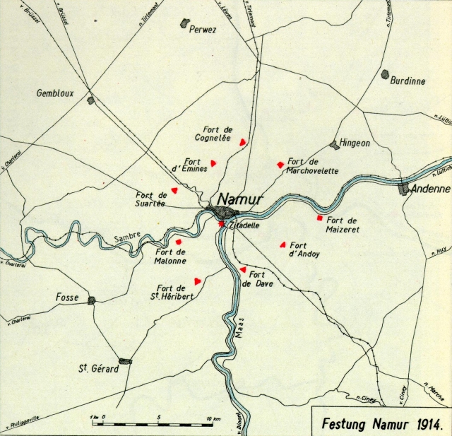 Im Jahre 1914 waren 44 Kanonen und 13 Haubitzen und Mörser unter Panzer eingebaut; in den Zwischenfeldern wurden 87 und 80 mm Kanonen und 87 mm Haubitzen eingesetzt. Die Festung Namur bildete in beiden Weltkriegen eine geschlossene Festung. Als solche bildete sie gleichzeitig einen Stützpfeiler der Maas-Stellung, einen Brückenkopf der Maas-Sambre-Linie für Bewegungen des belgischen Heeres in beiden Richtungen und den rechten Schulterpunkt der Antwerpen-Maas-Stellung.