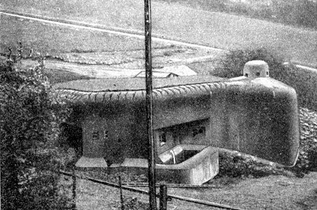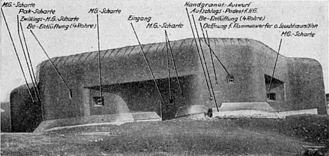 Zwischenräume der Einzelwerke durchschnittlich 500m, wechselnd nach taktischer Wichtigkeit und Geländebeschaffenheit. Hinter dieser vordersten Kampflinie als zweites Treffen: MG-Schartenstände. Außer den MG sind in den Infanteriewerken Pak, Minenwerfer und Flammenwerfer eingebaut. Als Hauptkampfräume sind zwei Flankierungsblocks vorgesehen, die je nach dem Kampfzweck an einer Scharte mit einer 4,7cm Pak mit aufgesatteltem MG und an der zweiten Scharte mit Zwillings-MG oder nur einem sMG oder an beiden Scharten nur mit sMG oder Zwillings-MG ausgestattet sind. Am Werkeingang und auf der Kehlseite weitere MG-Scharten für die Eingangs- und Rückenverteidigung.