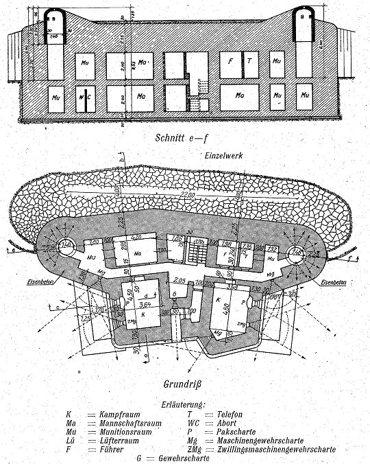 In der Mehrzahl sind die Einzelwerke zweigeschossig; zuweilen haben sie nur ein Geschoss. Im Obergeschoss der zweigeschossigen Werke befinden sich durchweg die Kampf- und Feuerleitungsräume einschließlich Munitionskammern, im Untergeschoss mit gleicher Raumeinteilung die Unterkünfte, Verpflegungsmagazine, Maschinenräume usw. Das Obergeschoß hat einen Verbindungsgang gleichlaufend zur Front, von dem die Eingänge aller Räume sowie die Treppe zum Untergeschoss abgehen. In den Flügeln des Ganges, nächst den Turmeingängen, ist eine MG-Scharte vorhanden, von welcher aus der vor der Flankierungsscharte liegende Trennungsgraben bestrichen werden kann. Ferner sind für die Graben- und Eingangsverteidigung Handgranatenauswurfrohre mit eigener Periskopbeobachtung angebracht, um auch bei geschlossenen Scharten Widerstand leisten zu können.