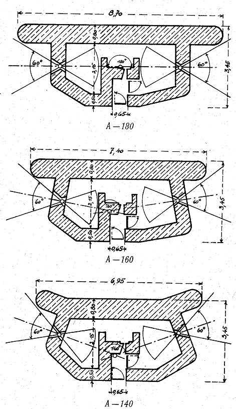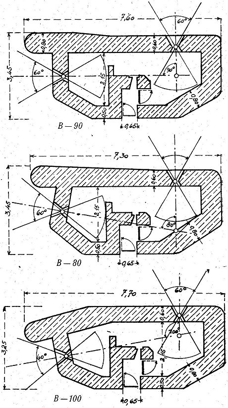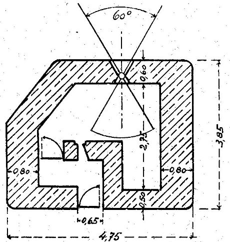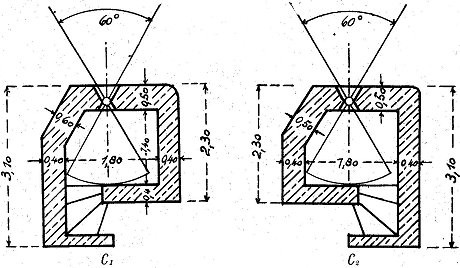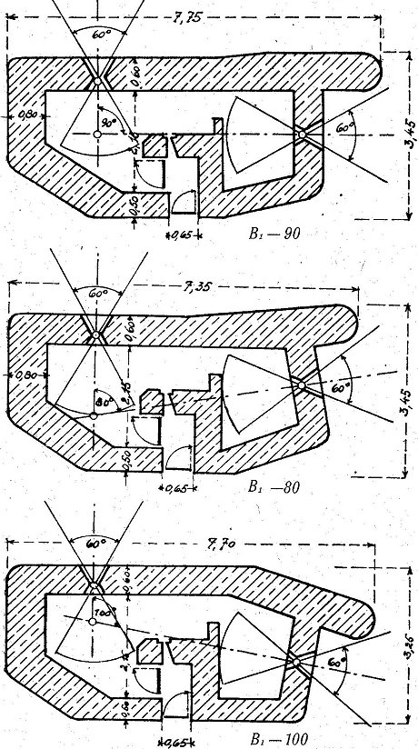 Muster A: 2 schwere MG für Flanken- oder Schrägfeuer Verstärkte Frontwand. Sie verläuft in der allgemeinen Richtung der Verteidigungslinie. Rückwärtige Grenze des Ausschwenkungswinkels reicht mindestens bis 100 Meter hinter das Nebenwerk. Eingangsverteidigung durch Scharte mittels Gewehr oder Pistole. Der Eingang ist gebrochen geführt und besitzt zwei Verschlüsse. Der erste, Eisengittertür mit 20mm Stäben, wird aus einer Scharte in der Wand gesichert. Hinter einem Vorraum eine Panzertür 60/150 cm und 10mm stark, zur Abschließung des Innenraumes. In der Panzertür Scharte 5,5 X 10cm für Pistole. Im Innenraum sind zwei sMG, Schießgestelle, Handlüfter und Beobachtungsfernrohr untergebracht. Die Scharte für die beiden sMG besteht aus einem Stahlgußrahmen. Besatzung: 1 Unteroffizier und 6 Mann. |