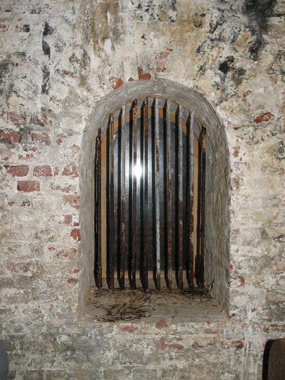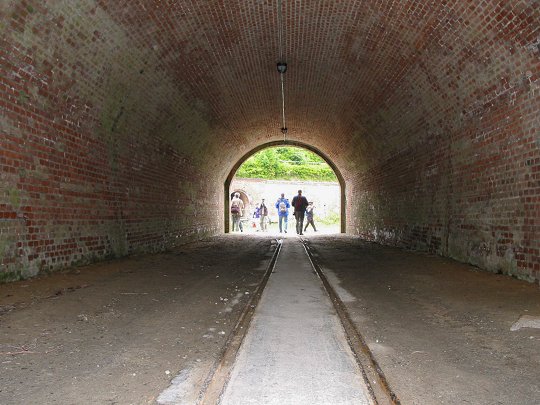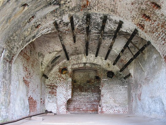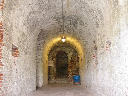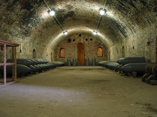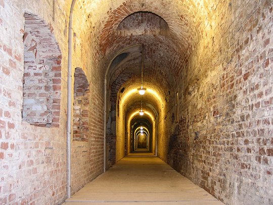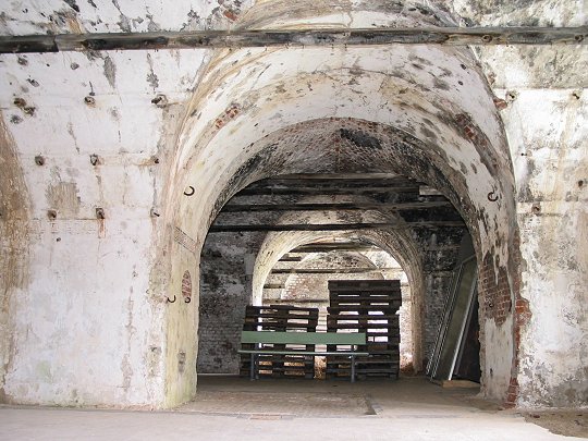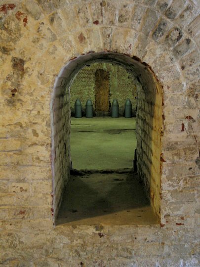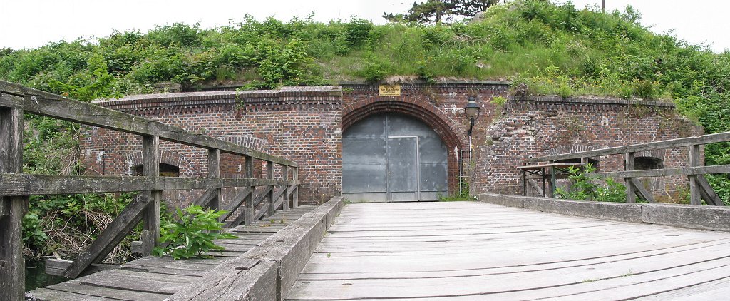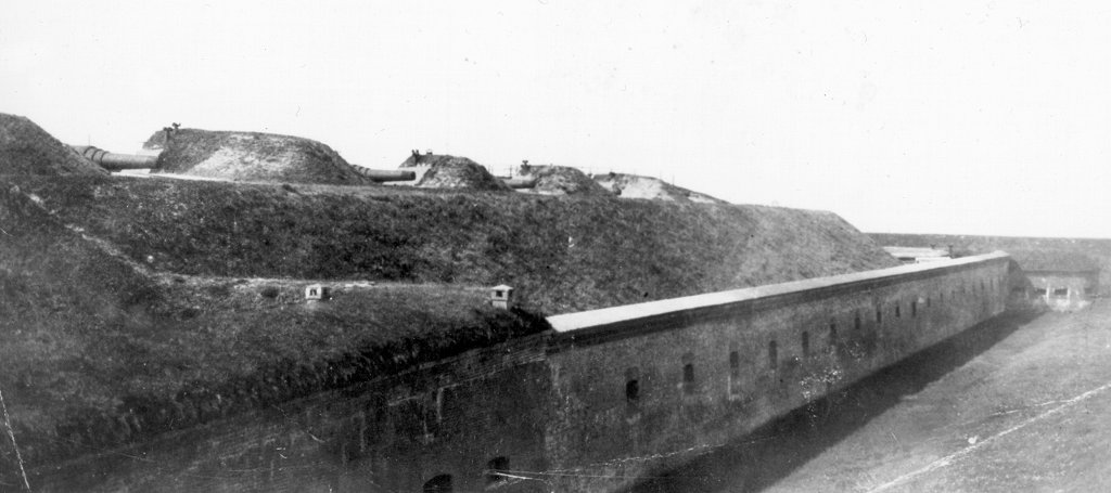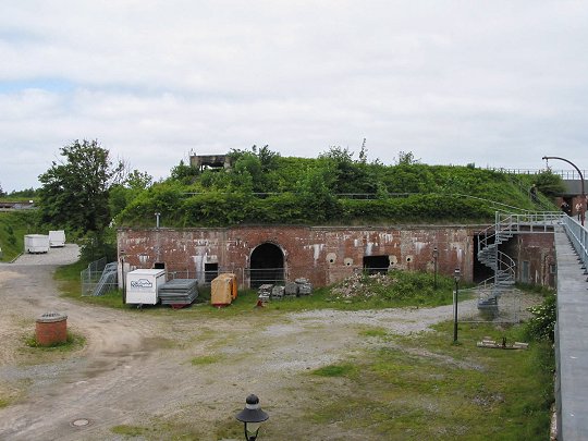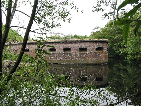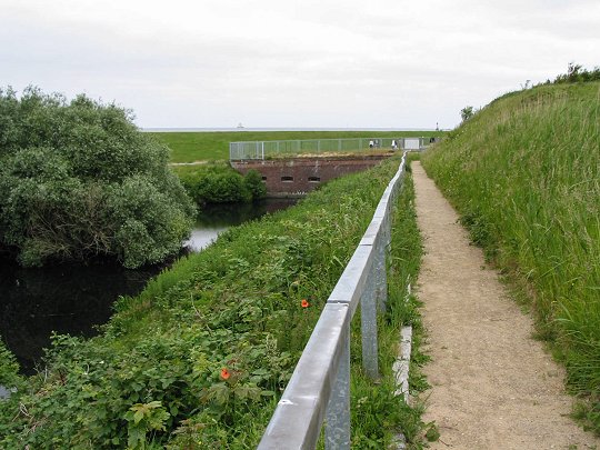 Die rechte Face über den nassen Graben gesehen. Die Geschütze stehen zwischen den Hohltraversen; ganz rechts die Grabenstreiche. |
