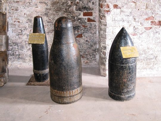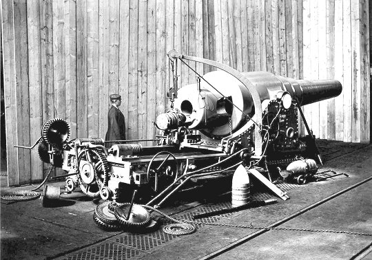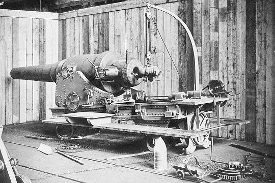 Die 28cm Ringkanone in Kastenlafette mit Arbeiter als Größenvergleich |