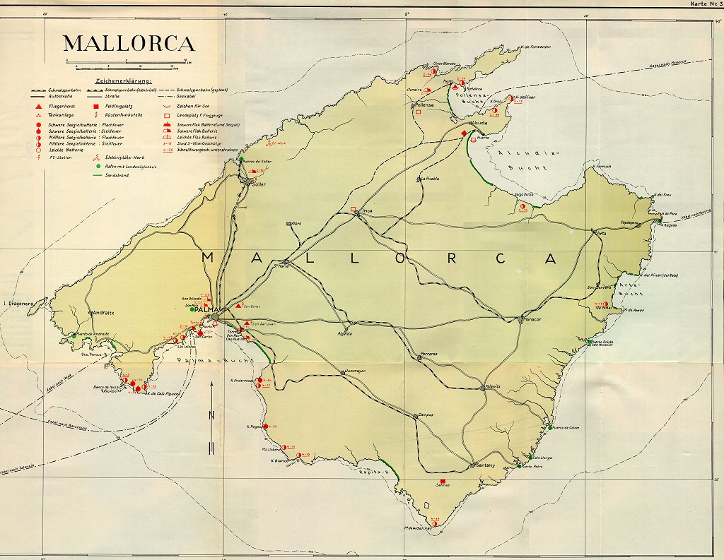 "Diese Insel, die größte und wichtigste der Balearen, misst in ihrer NS-Achse etwa 75, in der WO-Achse etwa 98 km. Die Nordwestküste eignet sich sehr schlecht zu größeren Landungsunternehmungen. Sie ist hoch, steil und wird durch den Nordhang einer bis zu 1445 m ansteigenden Gebirgskette gebildet. Sie verläuft ziemlich geradlinig und weist weder größere Buchten noch ausgedehnte Sandstrandstellen auf. Nur ein kleiner Hafenplatz – Puerto de Soller – ist vorhanden. Seine enge und bald flach werdende Bucht eignet sich nur bei gutem Wetter als Ankerplatz für einige größere Schiffe. Im kleinen Kunsthafen können nur Küstenfahrer bis zu 4,6m Tiefgang an den Kai gehen. Über dessen Ausrüstung keine Nachrichten vorliegen, die aber sehr unzureichend sein dürften. Verbindung durch elektrische Kleinbahn (Tunnel!) und Autostraße besteht nach Palma. Eine Küstenfunkstelle soll vorhanden sein; eine Flakbatterie steht in der Nähe.