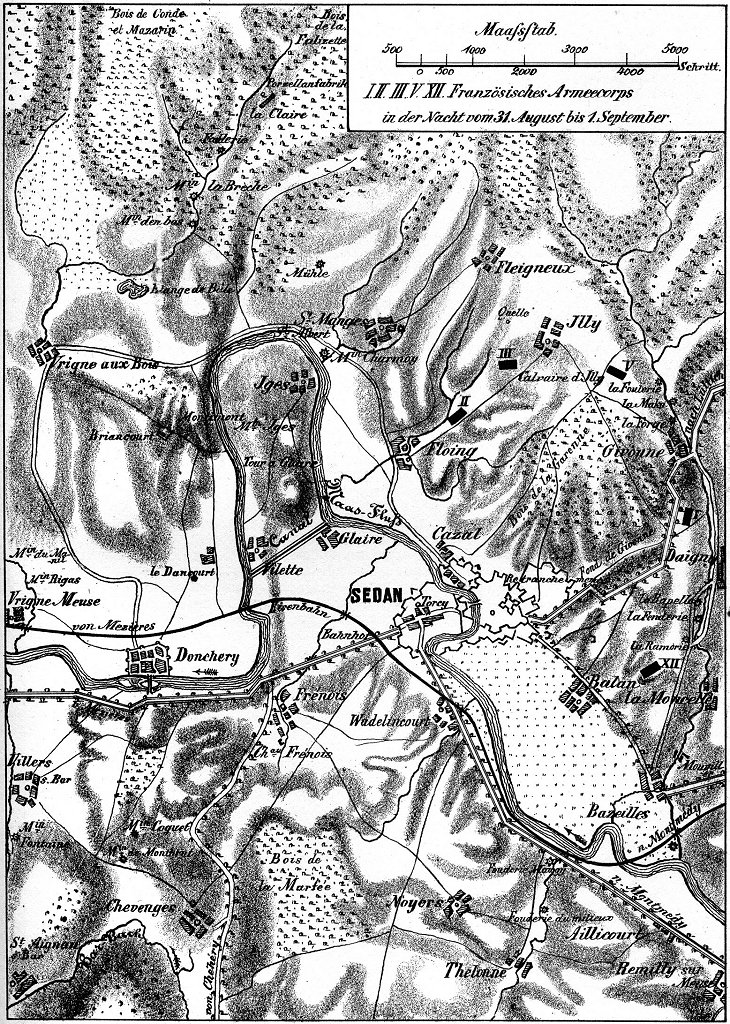"Sedan liegt an der Eisenbahn von Thionville nach Meziéres, am Strassenkreuz dieser und der von Bouillon aus Belgien kommenden Strasse. Es hat 16.000 Einwohner und ist eine bedeutende Fabrikstadt. Das niedrig gelegene, wiesenreiche Vorterrain im Westen hat viele Wasserläufe zur Maas; welche die Festung durchströmt; eine Meile oberhalb Sedan, bei Remilly nimmt sie den Chiers auf. Im Osten steigt das Terrain zu stark bewaldeten Höhen an, welche der Annäherung von dort her ungünstig sind. Die Festung Sedan liegt auf dem rechten Ufer der Maas, gegenüber die Vorstadt Torcy, welche durch eine bastionirte aus vier Fronten bestehende Befestigung eingeschlossen ist. Dieser Brückenkopf ist durch ähnliche Anschlüsse mit der Hauptbefestigung verbunden; den Kern derselben bildet die stark profilirte Citadelle und das Schloss, in welchem 1622 der Marschall Turenne geboren wurde. Mehrere Hornwerke mit Ravelinen decken die Citadelle gegen Osten, vor welchen ein geräumiges Retranchement vorgeschoben ist, um das dortige sehr coupirte Terrain und die Strasse nach Lüttich unter Feuer zu nehmen. Die Gräben sind nur auf der niedriger liegenden Südfront nass und hier sowohl, wie in der übrigen Befestigung mit wohlerhaltenen Futtermauern eingefasst. Die Festung ist daher als vollkommen sturmfrei zu erachten und ein Angriff ohne besondere technische Vorbereitungen nicht ausführbar. Inzwischen sind die Mauerwerke bei den heutigen Leistungen der Artillerie nicht überall hinreichend gedeckt, um einen längeren Widerstand leisten zu können. Ebensowenig besitzt der Platz genügende bombensichere Unterkunftsräume für die Garnison und den Proviant und die räumliche Ausdehnung der Werke auf dem rechten Maasufer ist nicht der Art, um die erforderliche Anzahl von Truppen für grössere Ausfalloperationen aufnehmen zu können; eine Bedingung, wie sie die moderne Kriegsführung heutzutage bei einer Festung durchaus beansprucht.
