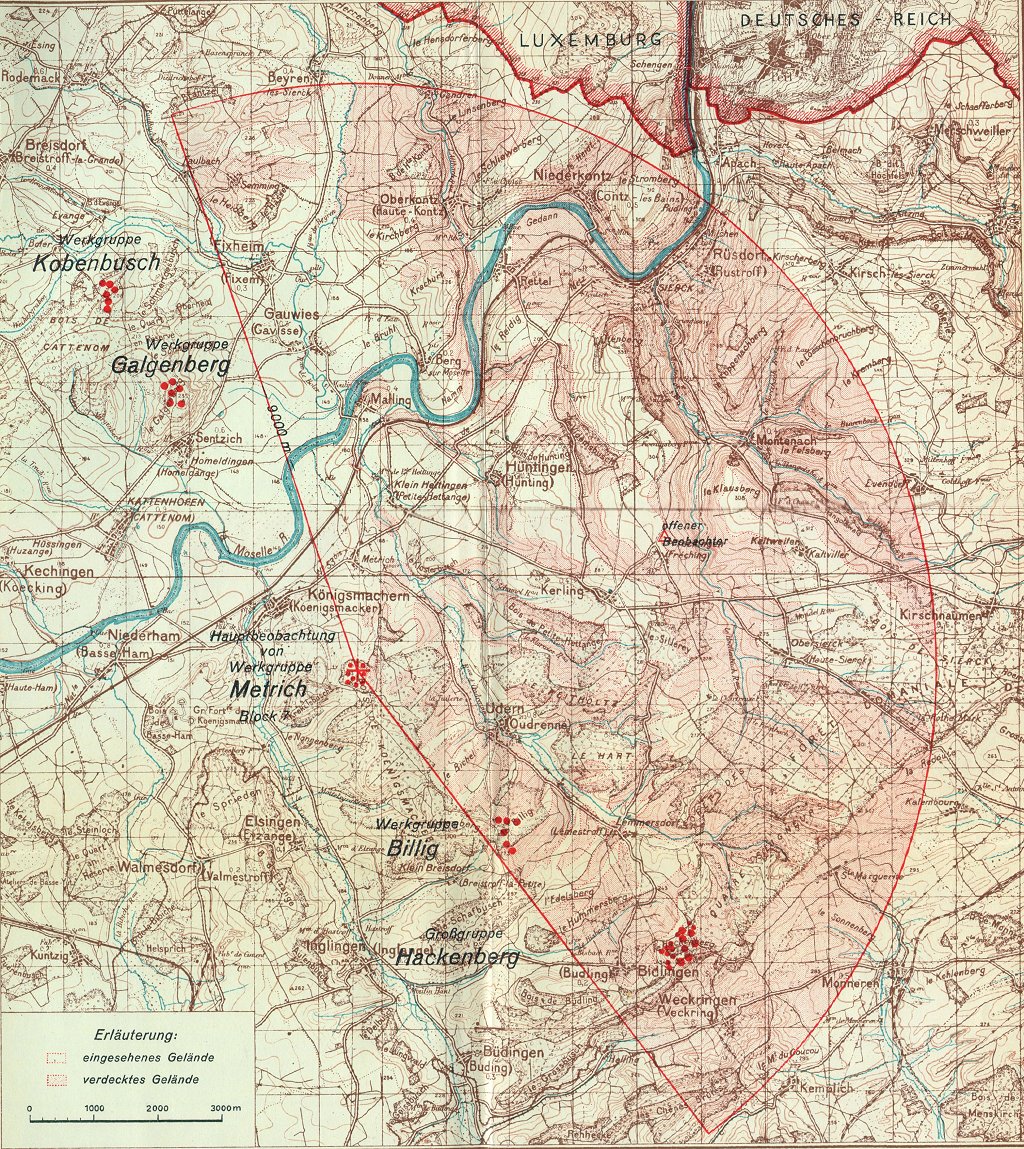 Beoabachtungsgebiet des Artilleriewerk Metrich Quelle: Denkschrift über die französische Landesbefestigung Oberkommando des Heeres 1941 |