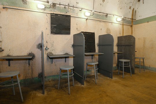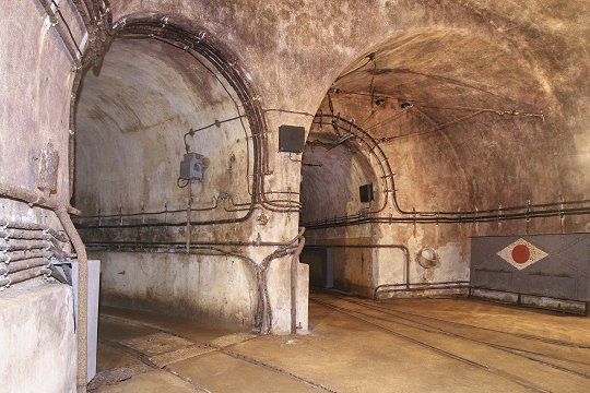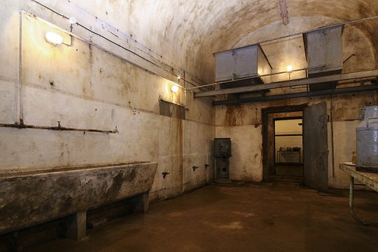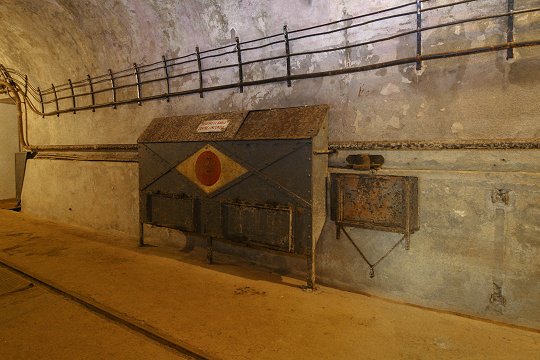 Block 6: Ein Panzerturm mit zwei 13,5 cm Haubitzen, eine GFM-Panzerglocke Typ A für MG FM24/29 oder 50 mm Granatwerfer, eine Glocke für Granatwerfer und eine Panzerglocke für Zwillings-MG als Notausstieg. | |