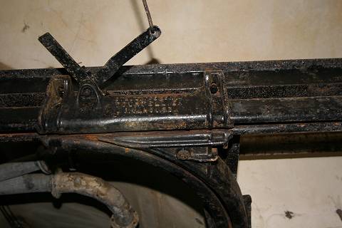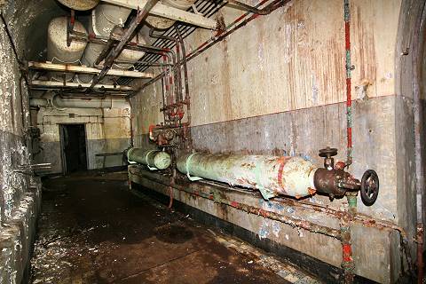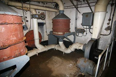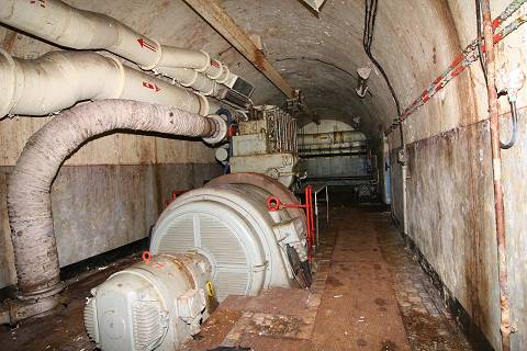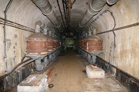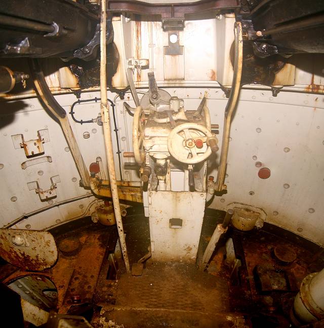 Im Inneren des Geschützturmes für zwei 75 mm Kanonen. Rohre links und rechts oben; mittig die Richteinheit. |