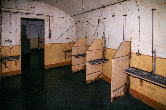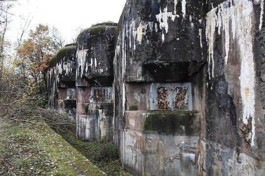 Block 5: Artilleriekasematte mit drei 7,5 cm Kanonen Modell 1929, einer 13,5 cm Haubitze, einer GFM-Panzerglocke Typ A für ein MG 24/29 und/oder einem 50 mm Granatwerfer und einer Panzerglocke für Granatwerfer (niemals ausgerüstet). | |
