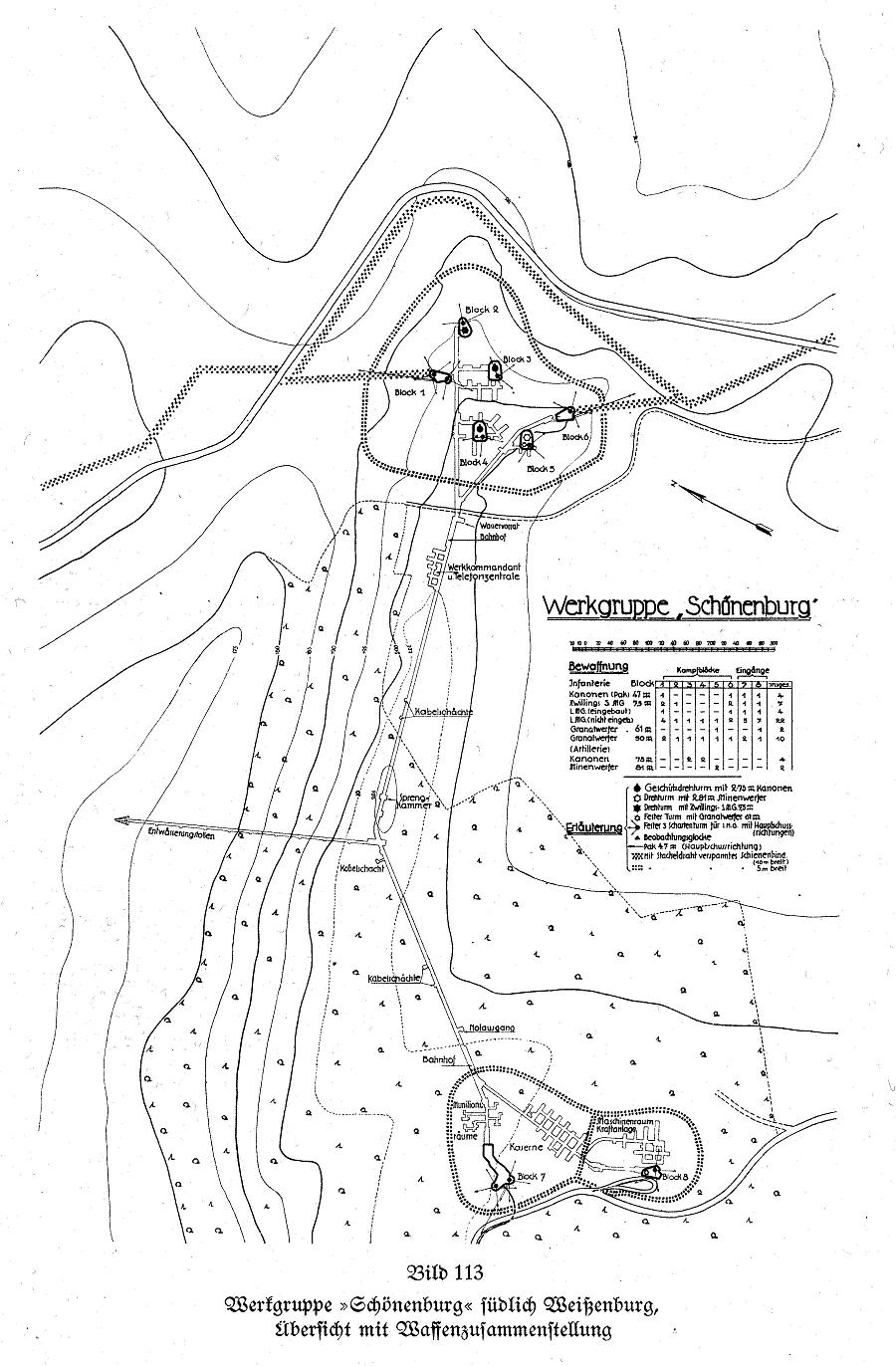 Das Artilleriewerk Schoenenbourg gehört zum Festungsabschnitt Haguenau und stellt durch seine Bauweise ein typisches Maginotwerk dar. Ausgestattet mit zwei Eingangsblöcken, einem Mannschafts- und einem Munitionseingang, besitzt es insgesamt sechs Kampfblöcke. Um autark agieren zu können besitzt es weiterhin alle notwendigen Versorgungseinrichtungen: unterirdische Kaserne, Küche, Vorratslager, Kraftwerk usw. Einziger Unterschied zu anderen Artilleriewerken ist, Schoenenburg besitzt kein zentrales Munitionslager. Hier wurden die Munitionslager direkt bei den Kampfblöcken angelegt.