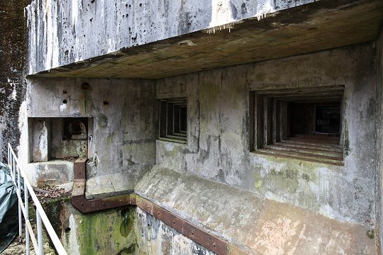 - 1 Scharte für Zwillings-Maschinengewehre Reibel MAC 31, austauschbar mit einer 47 mm Panzerabwehrkanone auf einer Doppelschiene.