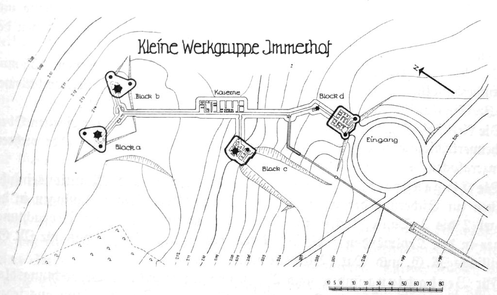 Plan des Infanteriewerk Immerhof Quelle: Oberkommando des Heeres Fest. Pi. Stab 13 "Kommandantur der Befestigungen Eifel und Saarpfalz" Az. 23/41 geh. Kdos. 01.10.1941 |