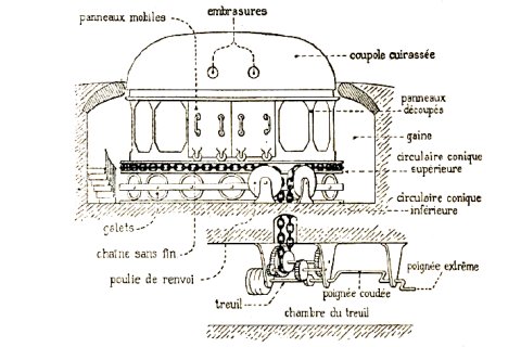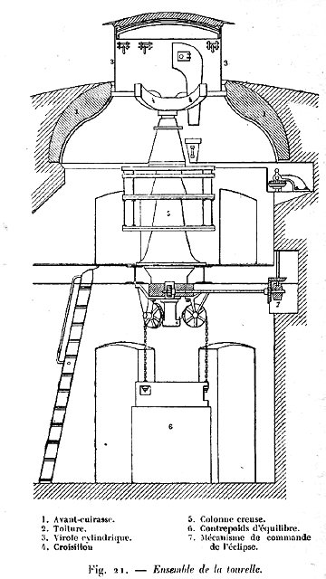 Aufbau des Maschinengewehrturms Quelle: Ministère de Guerre "Service des Canons sous Tourelle et Casemate et des Mitrailleuses sous Tourelle" 1911 |