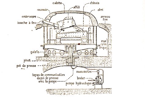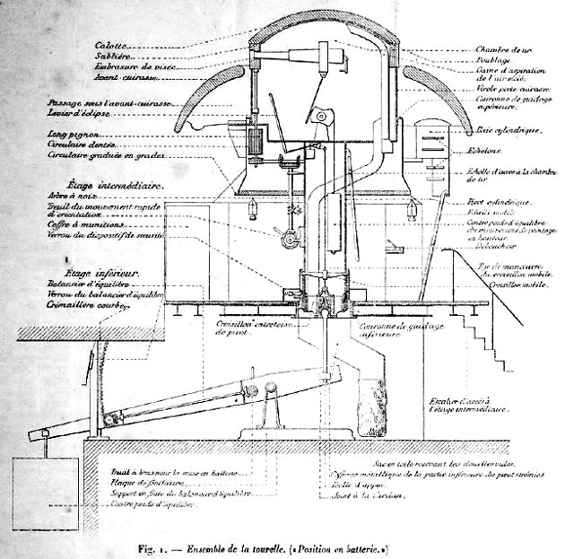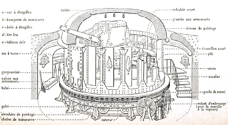Aufbau des Mougin-Panzerturms für zwei 155mm Kanonen Quelle: Ministère de Guerre "Reglement sur le Service des Canons de 155 long sur Affûts de Tourelle et de Casemate" 1892 |