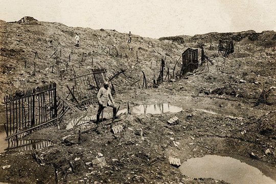Zerstörte Landschaft und Reste vom Hindernisgitter © BDIC |