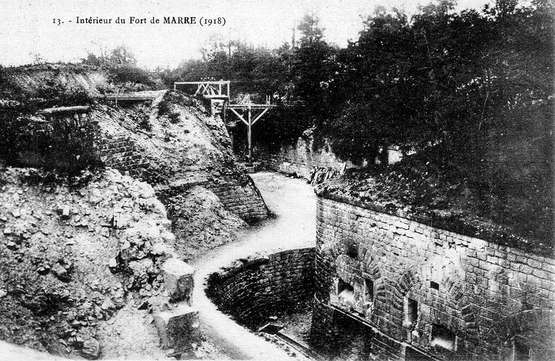 Fort Marre wurde zwischen 1875 und 1877 erbaut. Umbauten und Teilverstärkungen erhielt es in den Jahren 1888/89 und 1905/06, wobei ein Teil der alten Hofkaserne verschwand. Der Beginn des 1. Weltkrieges verhinderte den Bau von zwei 15,5cm Drehtürmen in Außenbatterien, die bereits 1913 geplant wurden. Während des 1. Weltkrieges wurde das Fort nicht in direkte Kämpfe verwickelt, griff aber immer mit seinem 7,5cm Panzerturm ein. Mit Beginn der deutschen Verdun-Offensive 1916 wurde auch Marre mit Kalibern bis zu 21cm beschossen, wobei Schäden nur an den aus Bruchsteinmauerwerk errichteten Gebäudeteilen entstanden. Auch unter Marre wurde, wie bei allen Forts von Verdun, ein weitläufiges Stollensystem angelegt.