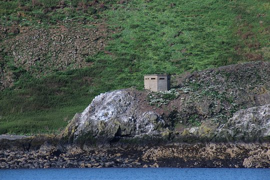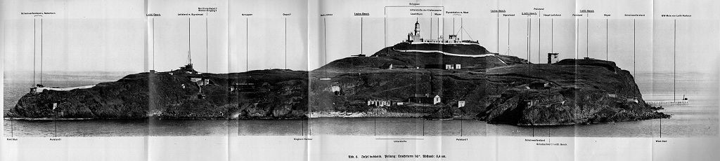 "Auf der Nordspitze (Still Pt.) eine betonierte Anlage mit Scheinwerferstand und Nebelhorn, hart westlich an der Uferböschung ein Peilstand. Ein mittleres Geschütz (15,2 cm) mit Schutzschild und nach hinten gezogenem Splitterschutz steht südlich davon auf der Höhe der Nordspitze, dicht dahinter ein turmartiger Leitstand mit Signalmast. Am Nordufer der Insel, entlang der Uferböschung mehrere Peil- oder Beobachtungsstände bis zur West Stell-Spitze, an deren Steilabfall zwei Scheinwerferstände mit Rolljalousien stehen. Die Höhe des West Stells ist mit einem mittleren Geschütz (15,2 cm), ebenfalls mit Schutzschild und Splitterschutz, bestückt. Zwei weitere Geschütze gleichen Kalibers stehen auf dem nach Südosten ansteigenden Höhenrücken. Zwischen beiden letztgenannten Geschützen erhebt sich anscheinend der Hauptleitstand. Die bisher beschriebenen Geschützstellungen und Anlagen sind durch ein Grabensystem untereinander verbunden. Gemauerte oder betonierte Stolleneingänge lassen auf das Vorhandensein von Kasematten und bombensicheren Unterständen schließen. In diesen oder einem der zahlreichen auf dem Nordteil der Insel vorhandenen Schuppen wird ein Minendepot und ein Lager für Sperrnetze vermutet. Auf der höchsten Erhebung der Insel (54 m über dem Meeresspiegel) stehen der Leuchtturm, die Unterkünfte der Küstenwache sowie eine Signal-Station. Die gesamte Anlage ist mit einer weithin sichtbaren Mauer umgeben. Etwa 50 m nördlich des Leuchtturms ein schweres Geschütz (23,4 cm) frei über Bank feuernd auf Betonplattform ohne Schutzschild: Schussrichtung etwa W über N nach SO. Zwei weitere Geschütze desselben Kalibers befinden sich auf dem allmählich nach SSO abfallenden Haupthöhenzug der Insel, ca. 100 m voneinander bzw. von der Signalstation entfernt. Schussrichtung beider Geschütze etwa N über O und S bis W. Die drei schweren Geschütze sind wahrscheinlich zu einer Batterie zusammengefasst. Zwischen Geschütz 1 und 2 auf dem Höhenkamm ein Signalmast, und auf dem Westabhang in der Nähe von Leith Harbour Unterkünfte der Besatzung. Auf der Nordpier dieses Hafens wurde 1936 eine Torpedobatterie von drei Rohrgruppen (Hauptschußrichtung nach NW) beobachtet, die aber gegenwärtig entfernt ist. Auf den Höhen der Südspitze stehen zwei mittlere Geschütze (15,2 cm) mit Schutzschilden, in einem Geländeeinschnitt zwischen beiden ein Leitstand; Peil- und Beobachtungsstände längs der Uferböschung. Die Bestückung der Ostseite der Insel ist unbekannt, es ist aber zumindest, besonders auf der Südspitze, mit Aufstellung von leichten Geschützen (Flak) und Maschinenwaffen zu rechnen."