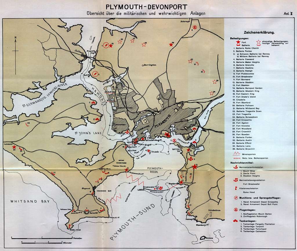 Der folgende Text stammt aus der Marinedienstvorschrift M.Dv. 502: "Fremde Marinen England Band A - Flottenstützpunkte und Küstenbefestigungen- Plymouth - Devonport" Oberkommando der Kriegsmarine; 3. Abteilung Seekriegsleitung 1938. Es handelt sich dabei um eine Ausarbeitung über die militärischen und wehrwichtigen Anlagen der britischen Heimatküste.