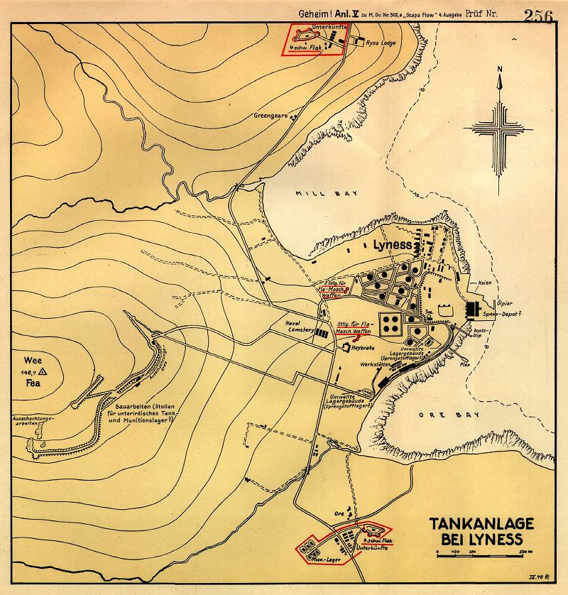 b) eine Batterie von vier schweren Flak durch Ringstraße verbunden, ca. 1½ km südllch Lyness, hart ostwärts der Straße Lyness - Crockness. Westlich der Straße Baracken und Unterkunftsgebäude, sowie sechs umwallte Munitionsbunker.