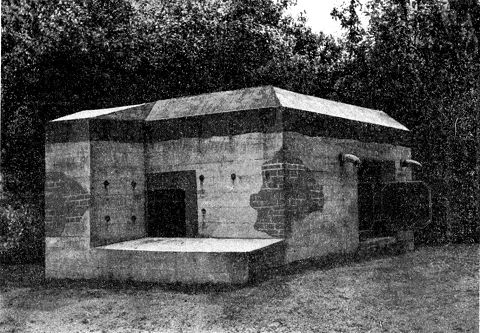 Dreischartenstand für sMG Der Dreischartenstand für sMG wurde in nur geringer Anzahl (45 Stück) in der Maas-, Grebbe- und Peel-Ram-Stellung gebaut. Der Eingang lag in der Rückwand, Zugang unmittelbar vom Freien. Diese Dreischartenstände haben sich nach Aussage der Niederländer nicht bewährt. Sie wurden infolge der Frontalscharten schnell erkannt und durch Schartenbeschuß mit Pak und MG außer Gefecht gesetzt oder durch Beschuß mit 8,8cm Flak völlig zerstört. |