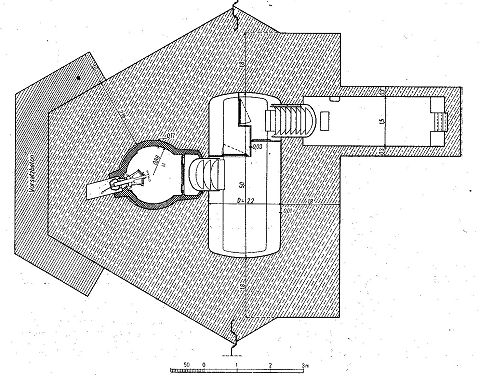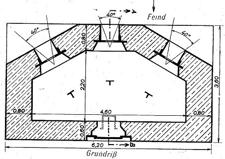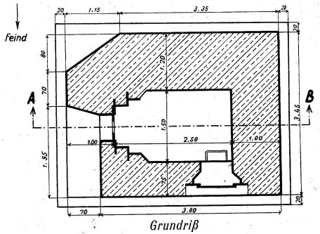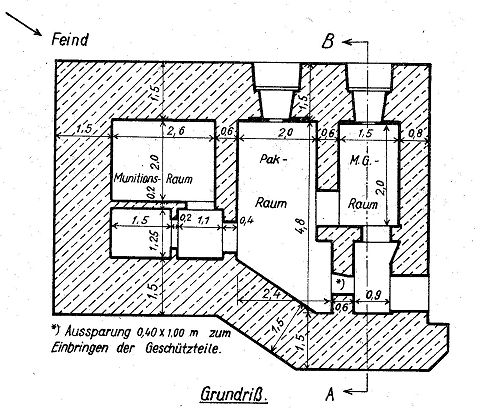 Pak- und MG-Schartenstand Zweigeschossiger Pak- und MG-Schartenstand. Die Munitions- und Maschinenräume befinden sich im Untergeschoß. Der MG-Tisch ist aus Eisenbeton. Die Pak- und MG-Schartenstände wurden nicht als Regelbauten ausgeführt, sondern je nach Örtlichkeit besonders entworfen. Sie haben sich, wie die Kämpfe 1940 zeigten, nicht bewährt, da sie infolge ihres hohen Aufzugs und der Schwierigkeit guter Tarnung schnell erkannt und durch Pak und Flak niedergekämpft wurden. |