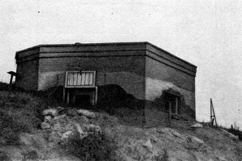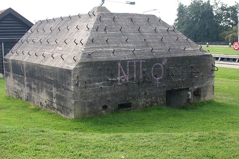 Pak- und MG-Schartenstand Zur Sicherung der wichtigen Straßen- und Eisenbahnbrücken wurden 83 dieser ein- bis viergeschossigen Pak- und MG-Schartenstände gebaut. Mehrgeschossige Ausführung nur, um Dämme und Deiche überschießen zu können. Besatzung 10 bis 13 Mann. Waffenausstattung 1 Pak, 1 sMG, Einsatz frontal oder flankierend. Beobachtung durch Rundblickfernrohr und aus den Scharten. Zur Nahverteidigung diente eine Gewehrscharte in der Eingangstür; kein Notausgang. |