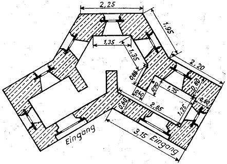 Dreischartenstand für lMG Der Dreischartenstand für lMG, von den Niederländern "spinnekop" genannt, ist die in allen Stellungen, ausgenommen "Neue Wasserlinie" und "Zeeland", am häufigsten gebaute Kleinkampfanlage. Insgesamt wurden 675 Dreischartenstände gebaut. Besatzung 3 Mann. Zur Nahverteidigung dient eine Gewehrscharte in der Eingangstür. Beobachtung nur durch die Scharten. Der Zugang zum Kampfraum erfolgte unmittelbar von außen. |