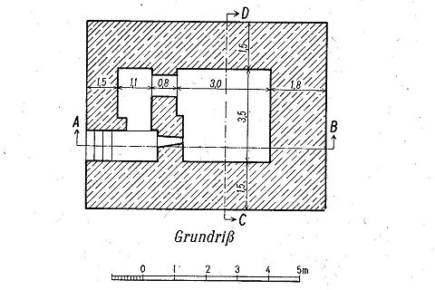 Unterstände In der "Neuen Wasserlinie" und in der "Südwasserlinie" wurden in großer Zahl (700 Anlagen) Gruppenunterstände gebaut. Besatzung 13 Mann. Zur Nahverteidigung diente eine Gewehrscharte nahe dem Eingang (nur in einzelnen Unterständen eingebaut). Für Beobachtung Rundblickfernrohr in Deckendurchbruch vorgesehen, aber nirgends eingebaut. Während der Durchführung des Ausbaues verringerte man wegen Baustoffmangels die Ausbaustärke um etwa ¼ der ursprünglichen Stärke. Die Decke ist im Verhältnis zu den übrigen Abmessungen stark (2,15 m) und nach den Seiten pyramidenförmig abgeschrägt, um ein Abgleiten der Fliegerbomben zu begünstigen. Der Eingang ist gebrochen, Notausgang fehlt. Die im Bild sichtbaren Haken dienen zum Befestigen von Tarnnetzen. |