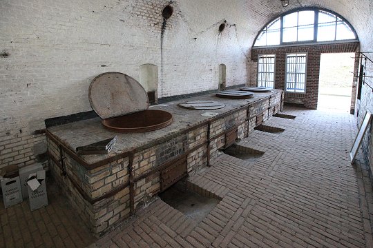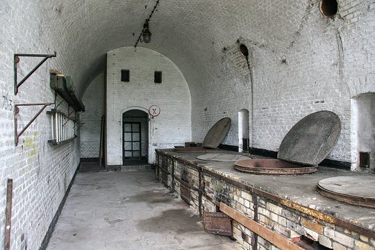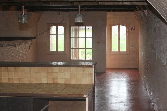 In der Kaserne befindet sich in gut erhaltenem Zustand eine Küche mit vier