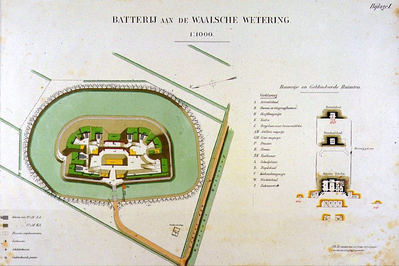 Das Werk aan de Waalse Wetering wurde zwischen 1875 und 1878 gebaut. Seine Aufgabe bestand darin, zusammen mit dem Werk aan den Korten Uitweg, die Gebiete unter Feuer zu nehmen, die nicht inundiert werden konnten. Als Bewaffnung dienten zwei lange 12cm Kanonen, vier 8cm Bronzekanonen, vier Coehoornmörser und später zwei Maschinengewehre M90. Die kleine Kaserne besteht aus zwei großen Kasematten für die Unterbringung der Mannschaften, Pulver- und Geschoßmagazin, sowie Küche und andere kleine Räume. Trinkwasser wurde aus einem Brunnen entnommen, die Latrinen befanden sich ausserhalb der kleinen Kaserne. Über eine Wendeltreppe kommt man in die darüber liegende Remise. Eine Besonderheit der Wendeltreppe ist die Röhre in der Mitte, über die Pulver und Geschoße über einen Flaschenzug in die Remise gezogen wurden. Zum Werk gehört noch ein Haus für den Fortwächter und ein Materialschuppen, der aber nicht mehr existiert. Die Besatzung bestand aus einem Offizier, acht Unteroffizieren und 86 Mannschaften. Während des 1. Weltkrieges wurde das Werk mobilisiert. Im Gegensatz zu anderen Forts und Werken ist hier keine Modernisierung in Form von betonierten Unterständen durchgeführt worden. Nach dem 1. Weltkrieg verkam das Werk, da es gegenüber modernen Waffen veraltet war und man ohnehin nicht an einen weiteren Krieg glaubte. Zu Beginn des 2. Weltkriegs ist es zu einer weiteren r Mobilisierung gekommen. Zusätzlich wurde die Gegend am 12.05.1940 durch Öffnung der Schleuse am Lek unter Wasser gesetzt. Über die Verwendung des Werkes während und nach dem 2. Weltkrieg ist nichts mehr bekannt. Im Jahre 1960 übergab die niederländische Armee das Werk an die Naturschutzbehörde. Sie kümmerte sich um den Erhalt des Werkes. So wurden im Jahre 2002 die Zugangsbrücke restauriert und die Erdwälle rekonstruiert. Das Werk ist heute frei begehbar.