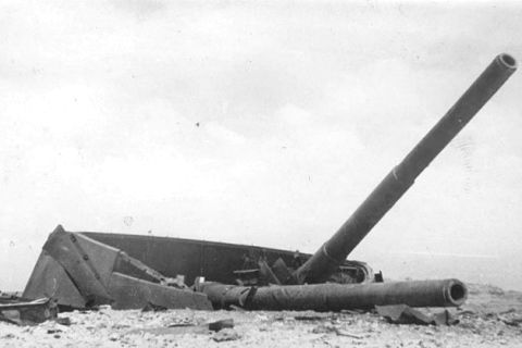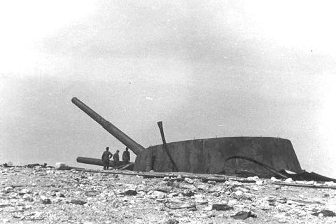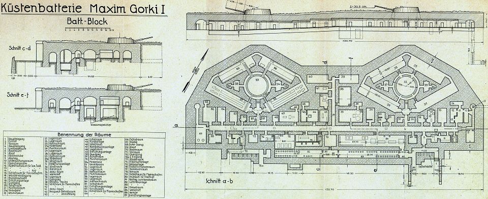 "Zur Bekämpfung von Seezielen errichtete der Russe 5 km nördlich des Hafens von Sewastopol in den Jahren 1914 bis 1934 die Panzerbatterie Maxim Gorki, 4 Geschütze 30,5 cm, Reichweite 44 km, in Zwillingsdrehtürmen mit seewärts gerichtetem E-Meßstand, Funkstand und unterirdischem, mit automatischem Kommandogerät neuzeitlich eingerichteten Feuerleiststand. Die 360 ° schwenkbaren Geschütze konnten mit Hilfsbeobachtung auch gegen Landziele wirken. Während der Belagerung haben sie Angriff und Nachschub oft gestört und in der Zeit vom 7. bis 17.6. rd. 600 Schuß (Spreng- und Panzergranaten sowie Schrapnells) abgegeben. Aufgebaut auf der Westnase eines schmalen Höhenrückens, der nach Norden ins Belbektal und teilweise auch nach Süden steil und geröllig abfällt, ostwärts aber wellig ansteigend in breiteres kahles Höhengelände übergeht, liegt der Batterieblock. Der Eisenbetonbau hat rd. 5000 m² Grundfläche und 3 bis 4 m Deckungsstärke. Seitlich gestaffelt ist eine äußere Kraftstation gleichstarker Bauweise. Der E-Meßstand liegt ebenso wie der Funkstand und der Feuerleitstand rd. 750 m von der Batterie ostwärts abgesetzt und mit dieser durch tiefliegenden Hohlgang verbunden auf einer die Batterie etwas überhöhenden und als Stützpunkt ausgebauten Schwelle des Bergrückens, in deutschen Karten als „Fort“ oder „Bastion“ bezeichnet. Ein Vollspurgleis führt zu den Panzertürmen, eine Straße zu den Eingängen des Batterieblocks.