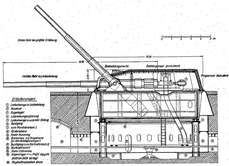 Schnitt durch den Panzerdrehturm Quelle: "Nachtrag zu den Denkschriften über fremde Landesbefestigungen" des OKH vom 01.04.1943 |