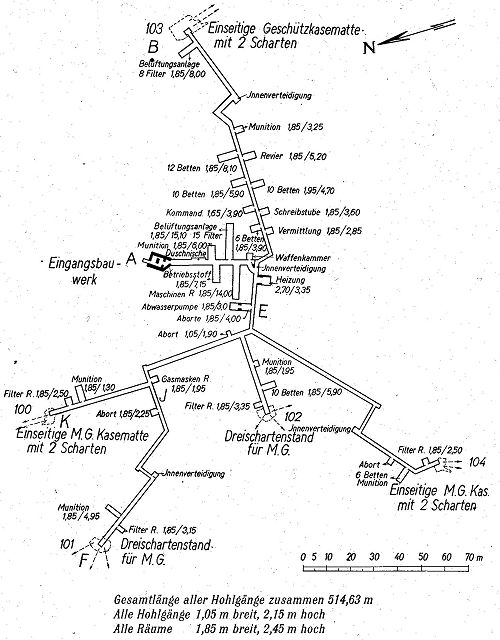 Die sechs Bunker sind mit Hohlgängen von insgesamt 515 m Länge untereinander verbunden. Die Stände liegen allgemein zu hoch am Hang, so dass der Verteidiger die gestreckte Flugbahn seiner Waffen nicht ausnutzen konnte. Für die Oberflächenverteidigung sind nur Schützenlöcher vorgesehen. Die Werkgruppe besitzt eine eigene Kraftzentrale, Wasserversorgung, Zentralheizung und Be- und Entlüftungsanlagen. Die sanitären Anlagen, wie Waschräume, Aborte und Abwässerbeseitigung stehen auf der Höhe der Technik. Der Munitionsaufzug wird elektrisch betrieben. Vermutliche Besatzungsstärke rund 130 Mann.